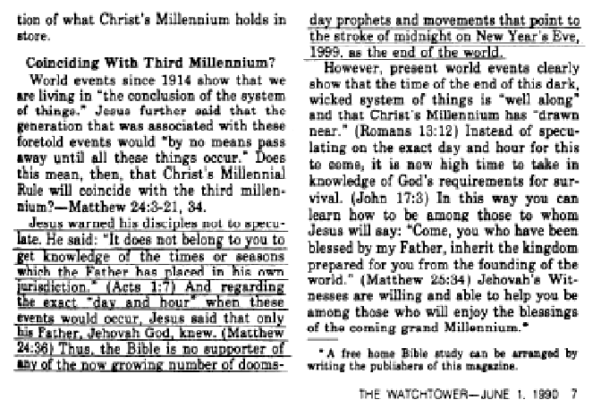 Question:  Let us follow that up just a little. It was promulgated as a matter which must be believed by all members of Jehovah's Witnesses that the Lord's Second coming took place in 1874? Answer:  I am not familiar with that. You are speaking on a matter that I know nothing of. Question:  You heard Mr. Franz's evidence? Answer:  I heard Mr. Franz testify, but I am not familiar with what he said on that, I mean the subject matter of what he was talking about, so I cannot answer any more than you can, having heard what he said. Question:  Leave me out of it. Answer:  That is the source of my information, what I have heard in court. Question:  You have studied the literature of your movement? Answer:  Yes, but not all of it. I have not studied the seven volumes of "Studies in the Scriptures," and I have not studied this matter that you are mentioning now of 1874. I am not at all familiar with that. Question:  Assume from me that it was promulgated as authoritative by the WBTS that Christ's Second Coming was in 1874. Answer:  Taking that assumption as fact, it is a hypothetical statement. Question:  That was the publication of false prophecy? Answer:  That was the publication of a false prophecy, it was a false statement or an erroneous statement in fulfillment of a prophecy that was false or erroneous. Question:  And that had to be believed by the whole of Jehovah's Witnesses? Answer:  Yes, because you must understand we must have unity, we cannot have disunity with a lot of people going every way, an army is supposed to march in step. Question:  You do not believe in the worldly armies, do you? Answer:  We believe in the Christian Army of God. Question:  Do you believe in worldly armies? Answer:  We have nothing to say about that, we do not preach against them, we merely say that the worldly armies, like the nations of the world today, are a part of Satan's Organization, and we do not take part in them, but we do not say the nations cannot have their armies, we do not preach against warfare, we are merely claiming our exemption from it, that is all. Question:  Back to the point now. A false prophesy was promulgated? Answer:  I agree to that. Question:  It had to be accepted by Jehovah's Witnesses? Answer:  That is correct. Question:  If a member of Jehovah's Witnesses took the view himself that that prophesy was wrong and said so he would be dis-fellowshipped? Answer:  Yes, if he said so and kept persisting in creating trouble, because if the whole organization believes one thing, even though it is erroneous, and some body else starts on his own trying to put his ideas across then there is disunity and trouble, there cannot be harmony, there cannot be marching together. When a change comes it should come from the proper source, the head of the organization, the governing body, not from the bottom upwards, because everybody would have ideas, and the organization would disintegrate and go in a thousand different directions. Our purpose is to have unity. Question:  Unity at all cost? Answer:  Unity at all costs, because we believe and are sure that Jehovah God is using our organization, the governing body of our organization to direct it, even though mistakes are made from time to time. Question:  A unity based upon an enforced acceptance of false prophecy? Answer:  That is conceded to be true. Question:  And the person who expressed his view, as you say, that it is wrong, and was dis-fellowshipped, would be in breach of the Covenant, if he was baptized? Answer:  That is correct. Question:  And as you said yesterday expressly, would be worthy of death? Answer:  I think --- Question:  Would you say yes or no? Answer:  I will answer yes, unhesitatingly. Question:  Do you call that religion? Answer:  It certainly is. Question:  Do you call it Christianity? Answer:  I certainly do.