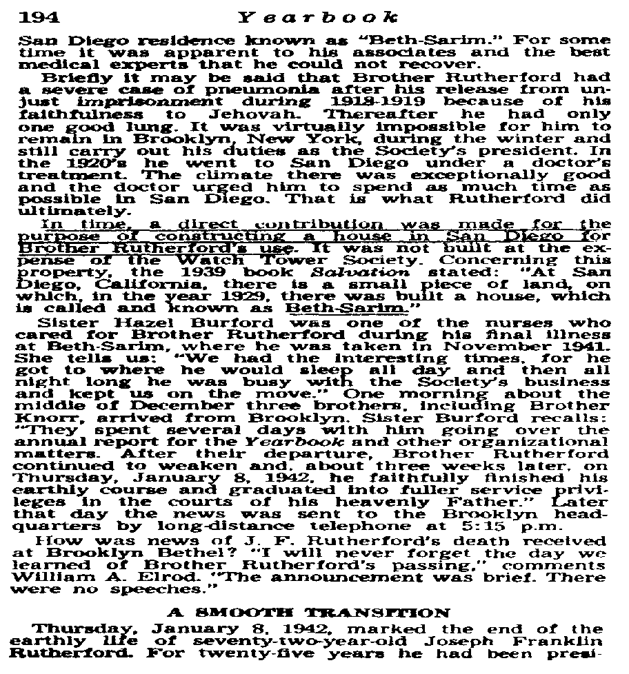 "In time, a direct contribution was made for the purpose of constructing a house in San Diego for Brother Rutherford's use. It was not built at the expense of the Watch Tower Society. Concerning this property, the 1939 book Salvation stated: 'At San Diego, California, there is a small piece of land, on which, in the year 1929, there was built a house, which is called and known as Beth-Sarim."