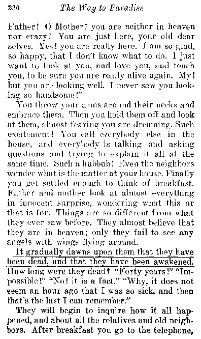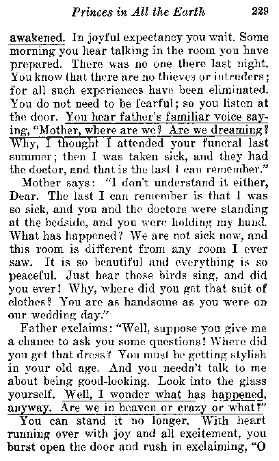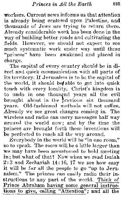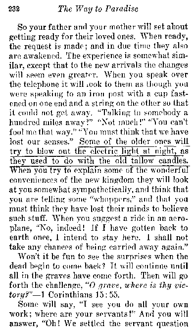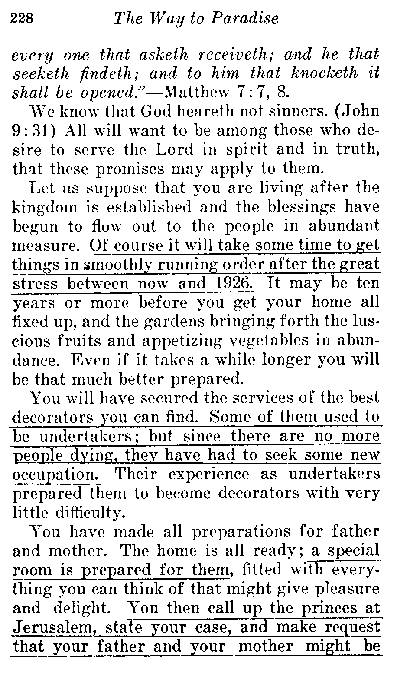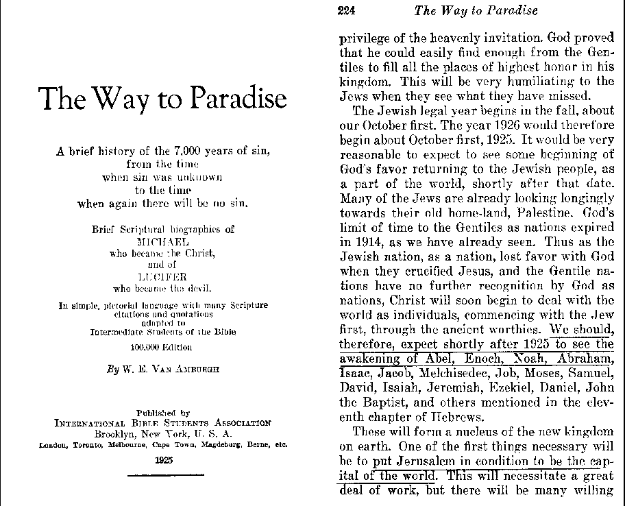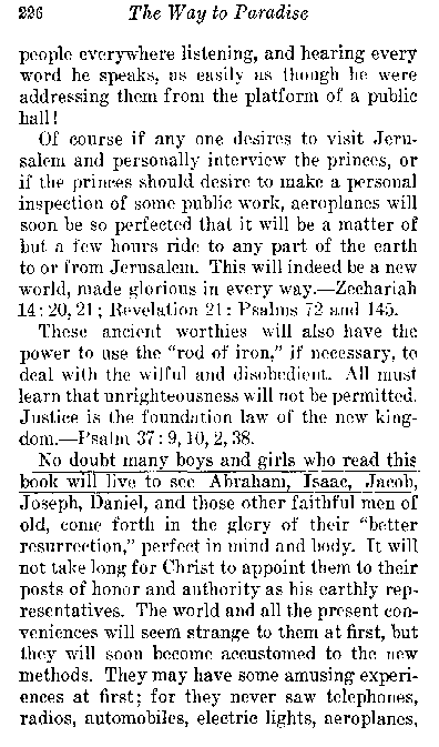 The WBTS also wrote books, such as 'The Way to Paradise' for 'Intermediate Students of the Bible', by W. E. van Amburgh (and approved by 'Judge' Rutherford!) explaining the incredible reactions of the Old Testament 'Princes' and some of the 'resurrected faithful' when their prophesy was fulfilled, e.g. (see p224 below) the claim that: